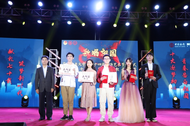 简短的开幕式后,“歌唱祖国”第二十届校园十大歌手大赛决赛正式拉开帷幕。本届“十大歌手”决赛由“十强争霸”“突破重围”和“王座之战”等三个环节组成,十名实力唱将轮番出战,用天籁之音为祖国献礼,以饱满的热情、高亢嘹亮的歌声唱出浓浓爱国情。开场由天籁歌友会带来的《我爱你中国》 庆祝新中国七十华诞,悠扬的旋律向全场释放无限的感染力;紧接着选手以一曲《我和我的祖国》拉开战幕,直抒胸臆的歌词激励青年人要努力奋斗,与祖国同命运共呼吸,勇于追逐心中梦想。选手们各自以独具特色的唱功、魅力四射的舞台展现力,诠释了对音乐的热爱,展示了对梦想的执着,带给现场观众不一样的感动和精彩。最终经过三轮精彩角逐和专业评委、大众评委的综合评判,材料与能源学院邱泽楠同学凭借其极具特色的唱腔和高昂的气势,点爆全场,一举摘得冠军。经济与贸易学院张越洋同学、廖梓奥同学分别获得亚军、季军。人气王前三名则分别为材料与能源学院邱泽楠同学、国际教育学院朱玮婧同学、艺术与设计学院梁詠筌同学。