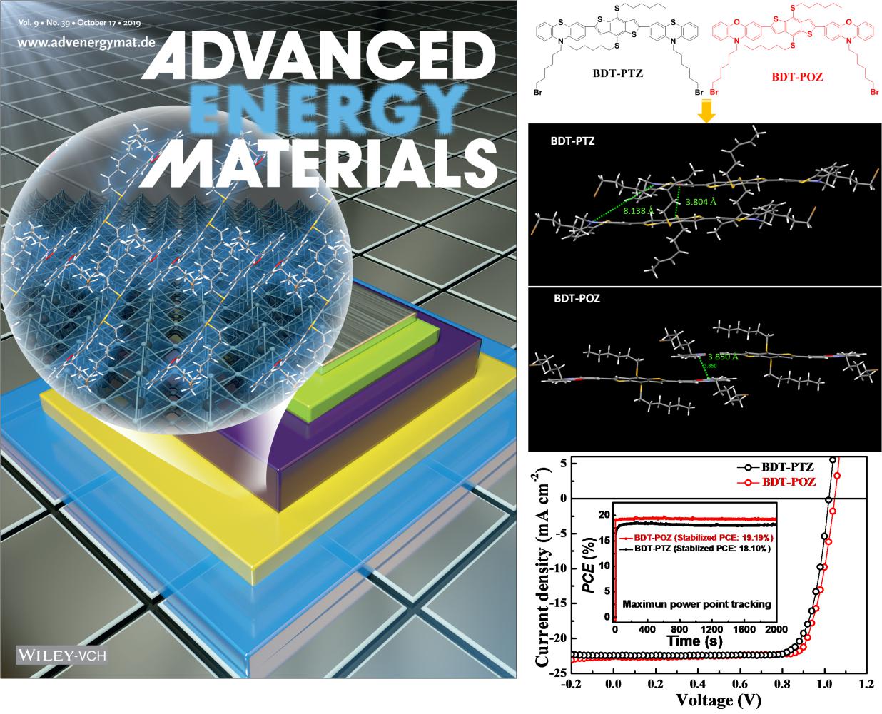 本网讯 近日,轻工化工学院有机光电材料与功能高分子团队蔡宁副教授和霍延平教授等人,联合香港城市大学Tsang Sai-Wing 教授在钙钛矿太阳电池研究领域取得重要进展,研究成果发表在国际能源材料领域的权威期刊Adv. Energy Mater.(IF=24.88,一区Top期刊),并于近日作为前封面文章出版(Rational Design of Dopant-Free Coplanar D-p-D Hole-Transporting Materials for High-Performance Perovskite Solar Cells with Fill Factor exceeding 80%.Yatong Chen, Xiuwen Xu, Ning Cai,* Sainan Qian, Ruixi Luo, Yanping Huo, Sai-Wing Tsang*Adv. Energy Mater.2019.9(39),1901268)。本工作中,基于理论计算的支撑,将合理设计并合成的D-p-D 型非掺杂空穴传输材料应用于反式平面钙钛矿太阳电池中,获得了最高81.7%的填充因子,并获得了19.16%的器件光电转换效率,同时揭示了分子结构/分子聚集态结构—空穴迁移率—器件性能之间的内在关系,为新型空穴传输材料的设计提供了新的思路。本工作我校研究生为论文第一作者,蔡宁副教授为论文第一通讯作者,我校为论文第一通讯单位,香港城市大学为论文的第二通讯单位。