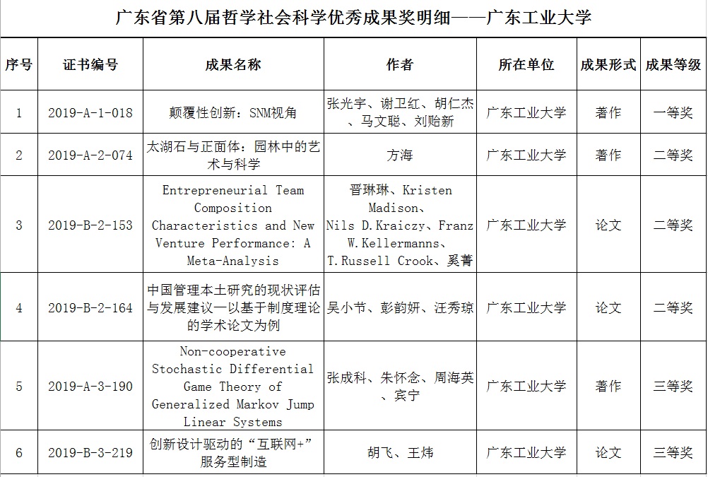 此次颁奖共评选出10位优秀社会科学家和230项哲学社会科学优秀成果奖,其中一等奖56项,二等奖119项,三等奖55项。我校共有6项成果获奖(详见附表),其中一等奖1项,二等奖3项,三等奖2项。这是我校继2015年首次获得一等奖后连续3届荣获广东省哲学社会科学优秀成果奖一等奖。