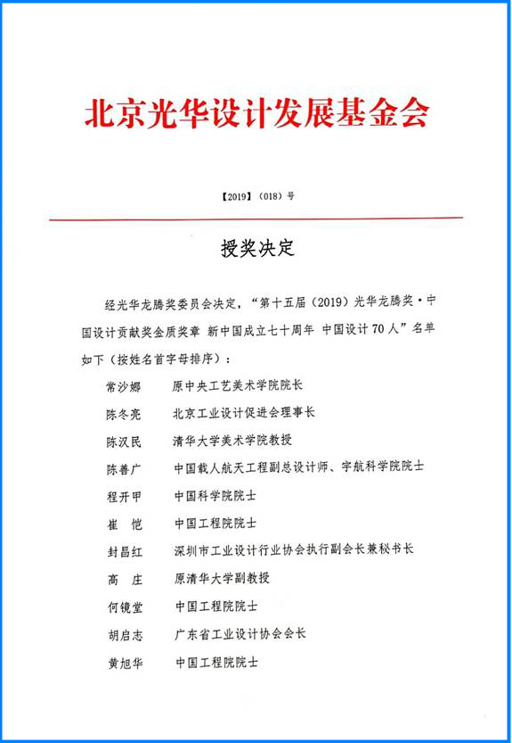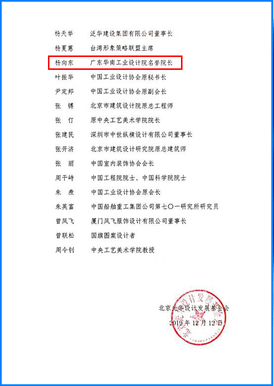 2019年时值新中国成立70周年,为表彰以创新设计为手段,为国家强盛、民族复兴、人民幸福执着奋斗的代表人物,光华设计基金会特别设立了“第十五届(2019)光华龙腾奖特别奖·中国设计贡献奖金质奖章·新中国成立七十周年中国设计70人”奖项。经评选,学校原艺术与设计学院院长、广东华南工业设计院名誉院长杨向东教授荣获“新中国成立七十周年中国设计70人”荣誉称号,成为新中国设计中坚力量的杰出代表。