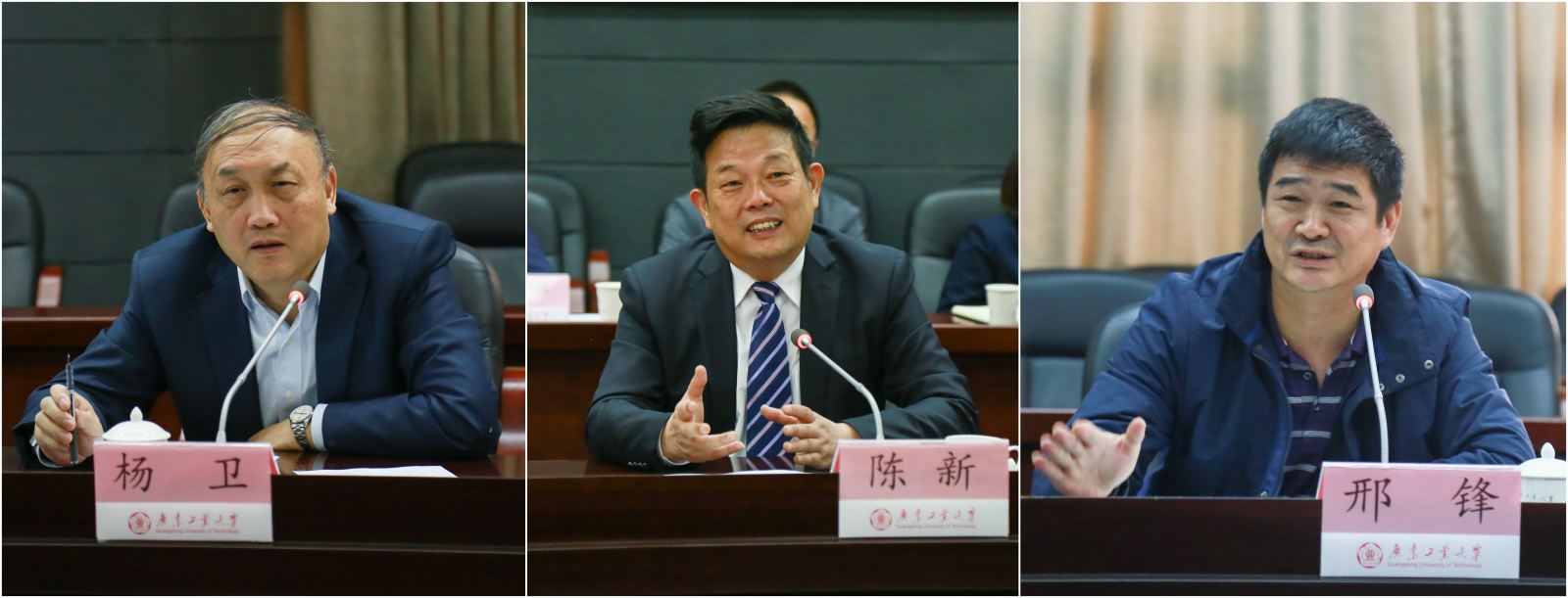 依次为专家组组长杨卫院士、校长陈新 、广东省教育厅副厅长邢锋