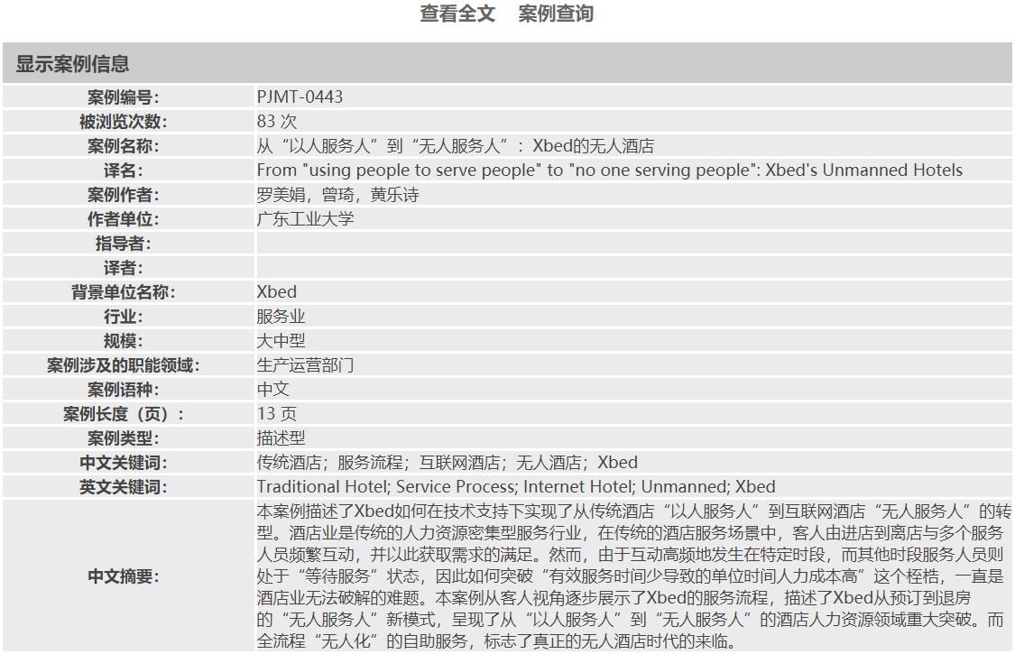 本网讯 由全国MBA教育指导委员会主办、中国管理案例共享中心承办的第十届“全国百篇优秀管理案例”评选已落下帷幕,我校管理学院两篇参赛案例成功入库,分别是:罗美娟博士和学生曾琦、黄乐诗编写的《从“以人服务人”到“无人服务人”:Xbed的无人酒店》(PJMT-0443),何军红副教授和学生李仲香、吴开艳、李甫编写的《优剪:移动互联网环境下的美业开拓者》(MKT-0647)。特此祝贺两位老师和团队成员!MBA教育中心于2019年5月份共组织10个案例参赛,其他案例还在陆续筛选中。