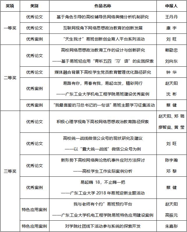 本网讯 按照广东高校网络思想政治工作中心《关于公布2018年度广东高校网络思想政治工作优秀成果评选结果的通知》(粤网络思政中心函〔2019〕8号),由广东高校网络思想政治工作中心、广东高校易班发展中心举办的2018年度广东高校网络思想政治工作优秀成果评选活动已顺利结束。经专家评审,活动共评选出“广东高校网络思想政治工作优秀论文”一等奖10项,二等奖20项,三等奖30项;“广东高校易班建设优秀案例”一等奖10项,二等奖15项,三等奖25项;“广东高校易班建设特色应用案例”一等奖5项,二等奖10项,三等奖15项;“广东高校易班建设探索与实践”优秀奖11项。
