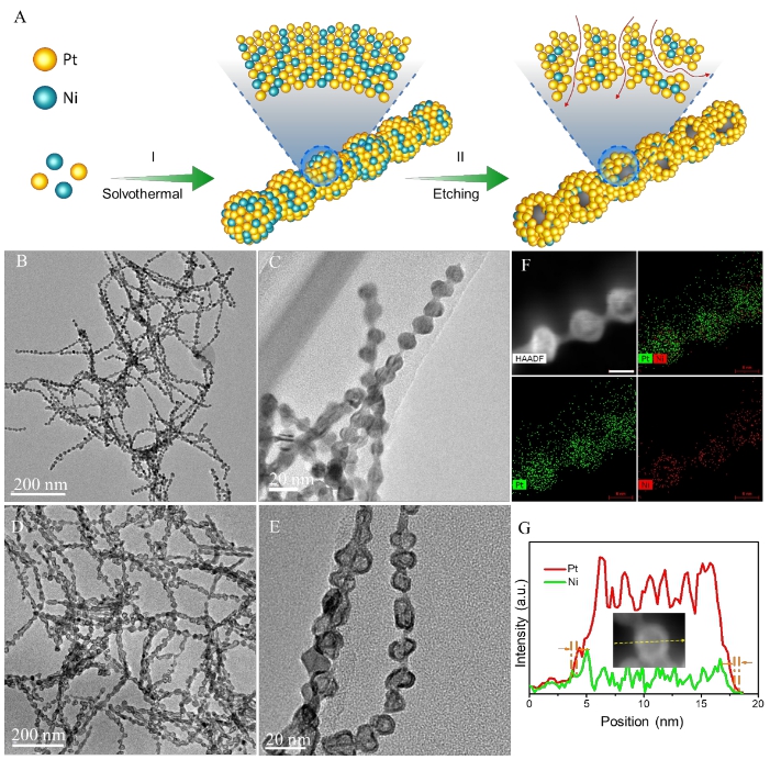 该文阐述了在高性能和高稳定性铂合金催化剂的最新研究成果,通过对铂基催化剂的近表面结构和组分进行调控,实现高稳定性一维结构和高活性的合金空心结构等特征的有效结合,从而大幅改善了铂镍合金催化剂在实际氢-氧燃料电池器件中的输出功率和使用寿命。当前,经济社会的高速发展使得开发新能源转换技术势在必行。氢能具有无污染和零碳排放等特点,是公认的清洁能源。近年来,我国和美国、日本、加拿大、欧盟等先后制定了氢能发展规划。我国有望成为氢能技术和应用领先的国家之一,也被国际公认为最有可能率先实现氢燃料电池和氢能汽车产业化的国家。氧还原反应是氢氧燃料电池和金属-空气电池等新能源技术的核心反应,需要价格昂贵、资源稀缺的贵金属铂作为催化剂来克服较为迟缓氧还原反应动力学。因此,研发低成本、高活性和高稳定性的氧还原催化剂是发展燃料电池等能源技术的关键。近年来,高效铂基催化剂的性能已经取得极大的突破,而对催化剂稳定性,特别是电池及器件稳定性的研究仍然较少。针对上述难题,田新龙教授采用(电)化学腐蚀方法对铂基催化剂的近表面结构和组分进行调控(图1),实现了铂镍合金催化剂在实际氢-氧燃料电池高性能。