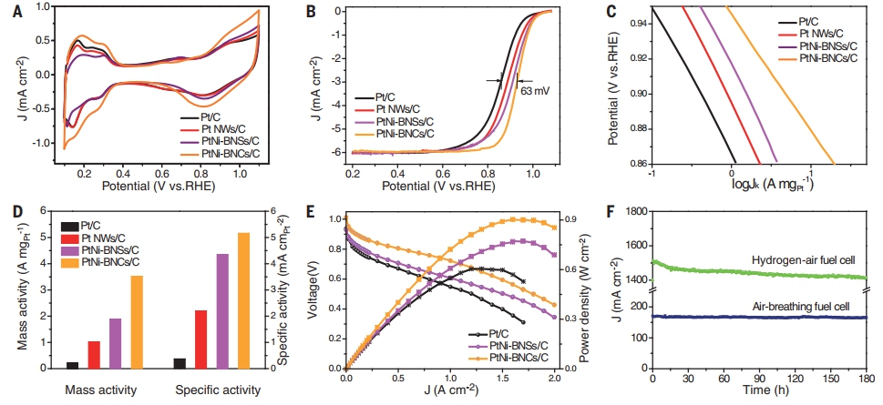 该催化剂的质量活性和比活性达到3.52 A mgPt-1and 5.16 mA cmPt-2,是目前商业铂催化剂的15倍以上。更加令人振奋的是,该催化剂展示出极为优异的催化稳定性,经过连续5万圈循环测试后,其质量活性只衰减了1.3%。此外,以该催化剂组装的燃料电池也展示出优异的性能和稳定性(图2)。原位X射线同步辐射吸收光谱和理论计算表明,这种催化剂结构有利于优化氧还原过程中的铂氧物种吸附强度,在改善氧还原催化性能的同时,亦能保持催化剂的较高性能和结构稳定性。
