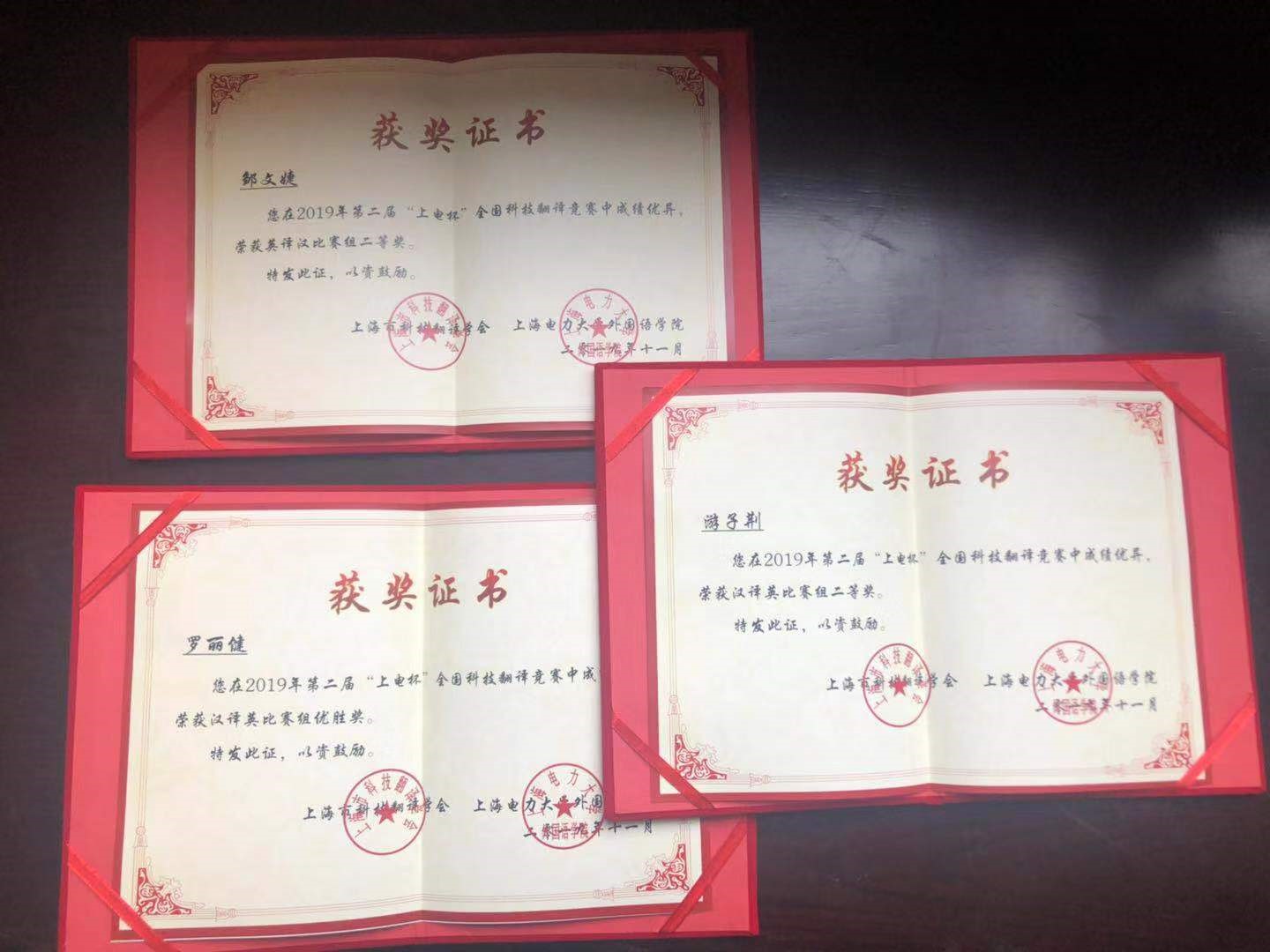 本网讯 11月23日,第二届“上电杯”全国科技翻译竞赛在上海举行颁奖典礼。我校外国语学院18级研究生邹文婕和游子荆,分别荣获英译汉和汉译英小组二等奖。18级研究生罗丽健获汉译英小组优秀奖。