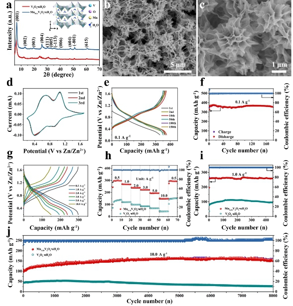 鉴于此,华亿体育(中国)游戏平台的李成超教授团队利用层间锰离子与水分子掺杂来协同提高五氧化二钒正极材料的锌离子传输动力学,并研究了其作为锌离子电池正极材料的电化学储锌性能和机理。结果表明,合成的Mn0.15V2O5·nH2O表现出优异的锌储存性能,其可逆容量高达367 mAh g-1(0.1 A g-1)。在10和20 A g-1的大电流密度下循环8000圈后,其比容量仍能保持在153和122 mAh g-1。即使在-20oC的低温下,电流密度为2.0 A g-1时,循环2000圈,比容量可以稳定在100 mAh g-1。该材料优异的电化学主要归根于其层间掺杂锰离子与水分子的协同作用,不仅提高了电极材料电子导电性,而且有效增强了锌离子嵌入脱出动力学。并且由于离子柱撑作用以及局域电荷相互作用,该电极材料在循环过程中的结构稳定性得以大幅提升。该工作借助非原位XRD、TEM等表征技术,对Mn0.15V2O5·nH2O电极材料的物相结构、微观形貌在充放电过程中的变化进行了深入研究,揭示了其电化学储锌机理,为高倍率、长循环性能锌离子电池正极材料的设计合成提供了依据。相关论文“Electronic Structure Regulation of Layered Vanadium Oxide via Interlayer Doping Strategy toward Superior High-Rate and Low-Temperature Zinc-Ion Batteries”在线发表在Advanced Functional Materials上(DOI: 10.1002/adfm.201907684)。