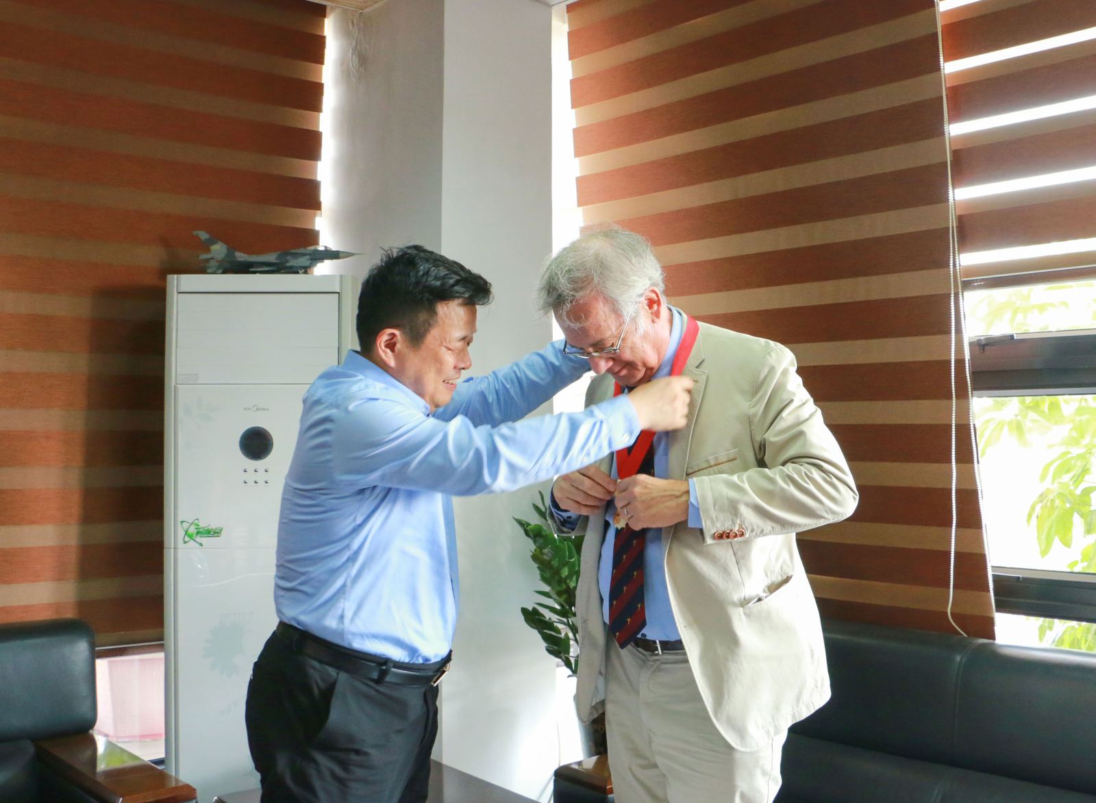 本网讯 11月18日,我校党委书记、校长陈新与我校特聘教授、广东省领军人才伯纳德·莫涅院士亲切会面、深入交流,并亲自为莫涅院士佩带奖章、合影留念。