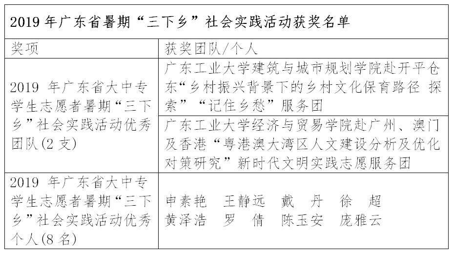 本网讯  近日,从省委宣传部、省文明办、团省委、省教育厅、省学联《关于2019年广东省大中专学生志愿者暑期文化科技卫生“三下乡”社会实践活动优秀单位、团队、个人名单的公示》获悉,我校荣获“2019年广东省大中专学生志愿者暑期‘三下乡’社会实践活动优秀单位”称号,建筑与城市规划学院赴开平仓东“乡村振兴背景下的乡村文化保育路径探索”“记住乡愁”服务团等2支团队荣获“2019年广东省大中专学生志愿者暑期‘三下乡’社会实践活动优秀团队”称号,申素艳等8名师生荣获“2019年广东省大中专学生志愿者暑期‘三下乡’社会实践活动优秀个人”称号,具体名单见附表。
