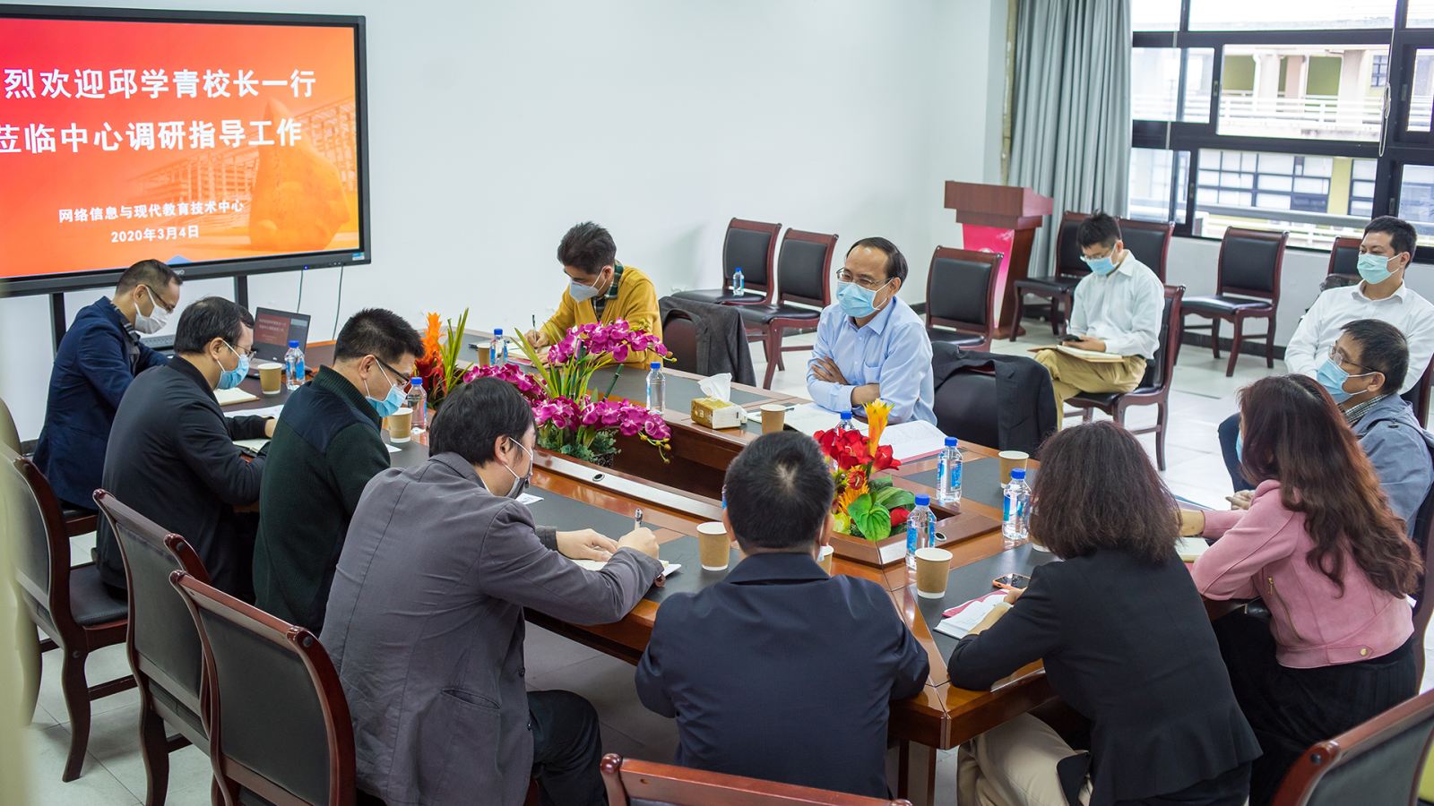 本网讯 3月4日上午,校长邱学青、党委副书记胡钦太、副校长章云及党政办、教务处、学生处等部门负责人一行到网络信息与现代教育技术中心调研指导工作。中心领导班子及职工代表参加了调研座谈。