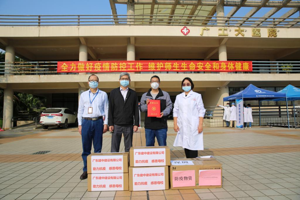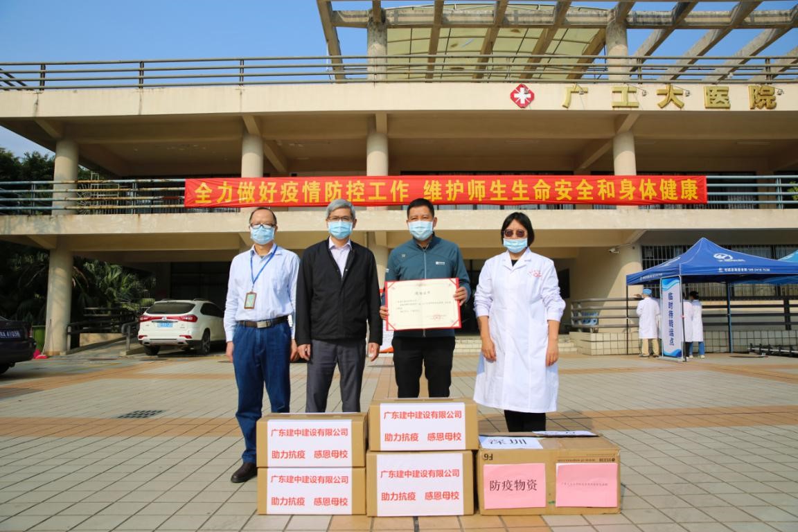 本网讯 3月2日上午,我校路桥专业96级校友、广东建中建设有限公司董事长胡铁刚和华亿体育(中国)游戏平台校友会深圳联络处向我校捐赠了一批防护口罩、消毒凝胶等防疫物资,支持母校战“疫”。学校新型冠状病毒感染的肺炎疫情防控工作领导小组常务副组长、副校长陈卓武代表学校在大学城校区接受了捐赠。学校疫情防控领导小组成员单位学校医院负责同志以及校友办负责同志等参加捐赠仪式。