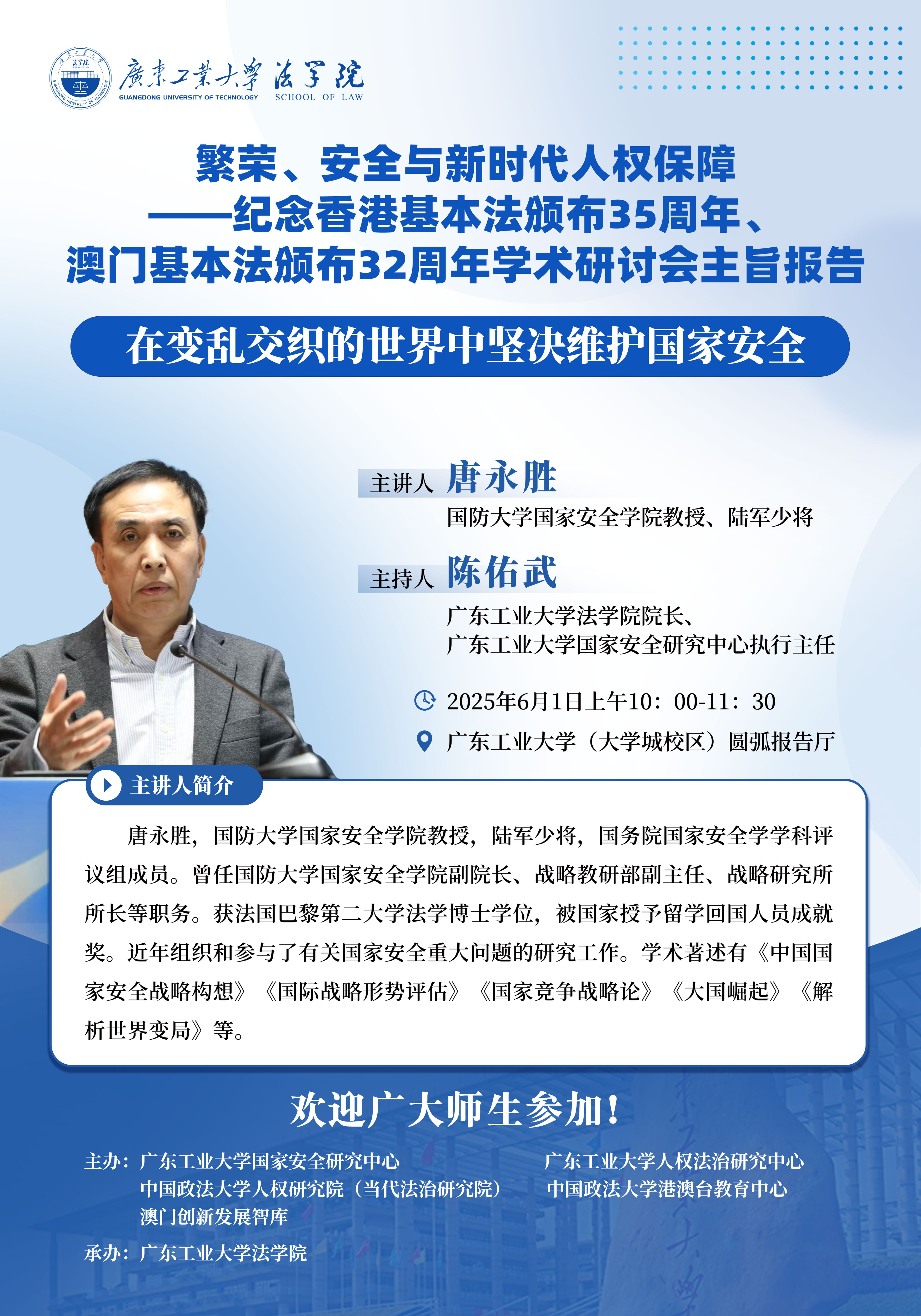 为深入学习贯彻落实习近平总书记在党的二十届三中全会提出的“全面贯彻总体国家安全观”“坚持正确人权观”的具体要求以及习近平总书记关于“促进香港澳门长期繁荣稳定,支持香港、澳门更好融入国家发展大局”的重要指示,华亿体育(中国)游戏平台法学院、华亿体育(中国)游戏平台国家安全研究中心、华亿体育(中国)游戏平台人权法治研究中心、中国政法大学人权研究院(当代法治研究院)、中国政法大学港澳台教育中心、澳门创新发展智库将举办“繁荣、安全与新时代人权保障——纪念香港基本法颁布35周年、澳门基本法颁布32周年学术研讨会”。届时将有来自国家安全、人权、法学等领域的50多名校内外知名专家学者参加。