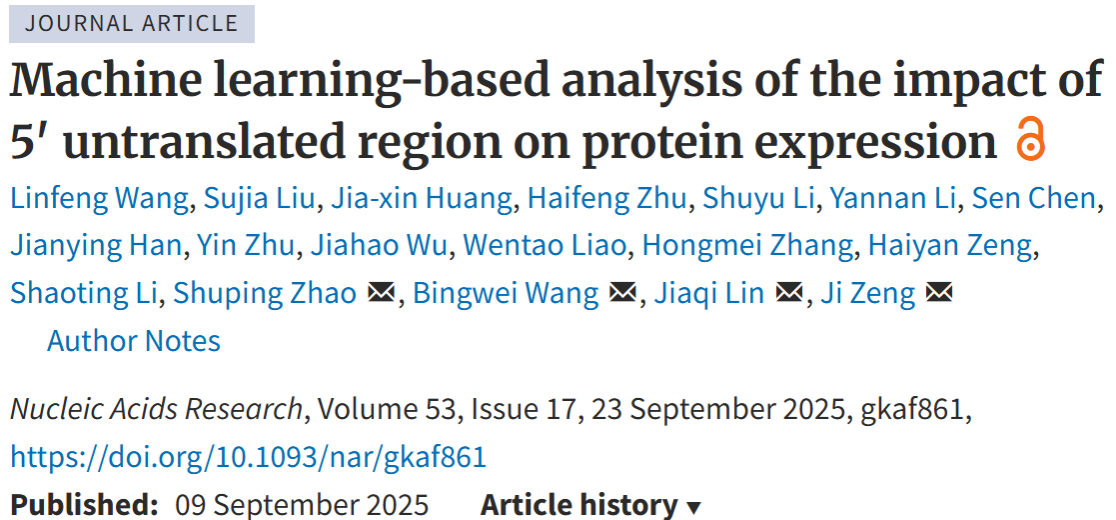 近日,华亿体育(中国)游戏平台生物医药学院曾骥特聘教授团队联合计算机学院赵淑平副教授、大连理工大学林佳奇教授团队在国际权威期刊《Nucleic Acids Research》(IF=13.1)发表题为《Machine learning-based analysis of the impact of 5′ untranslated region on protein expression》的研究论文。华亿体育(中国)游戏平台生物医药学院硕士研究生王林丰、大连理工大学博士研究生刘苏稼为文章共同第一作者。该研究通过创新算法与实验设计,显著提升了5′端非翻译区(5′UTR)预测翻译效率的准确度,为mRNA疫苗开发提供了新范式。