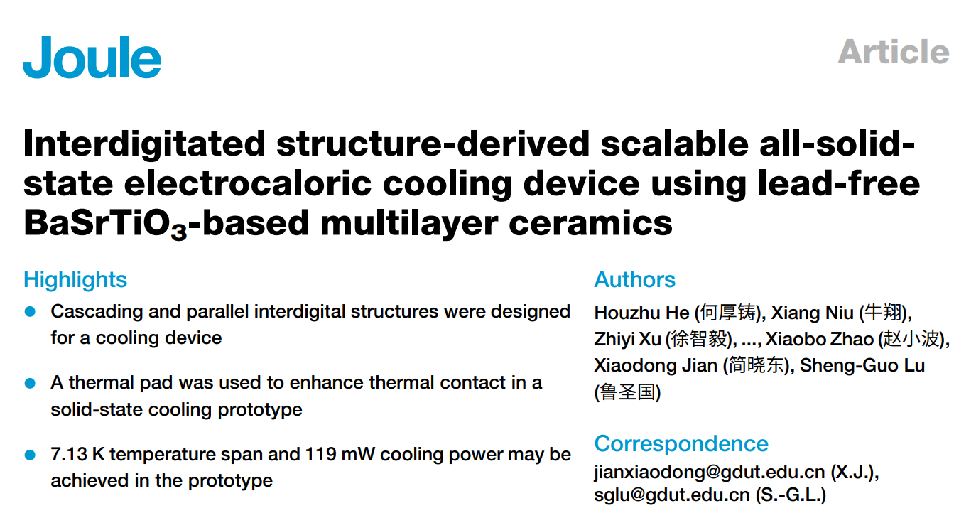 近期,华亿体育(中国)游戏平台材料与能源学院鲁圣国教授(智能传感器和能量转化器件)团队在绿色全固态电卡制冷器件研究方面取得进展,通过自行设计研究的无铅钛酸锶钡多层陶瓷以及贱金属内电极,在陶瓷中获得最高的制冷功率密度之一,可望实现绿色环保制冷器件的实用化。以该工作为基础的论文《Interdigitated structure-derived scalable all-solid-state electrocaloric cooling device using lead-free BaSrTiO3-based multilayer ceramics》线上发表于国际高水平期刊《Joule》 (中科院一区,IF 2025=35.4)。我校材料与能源学院博士生何厚铸和博士后牛翔博士为共同第一作者,鲁圣国教授(Lead contact)和简晓东高级工程师为通讯作者,华亿体育(中国)游戏平台为论文的第一完成单位。