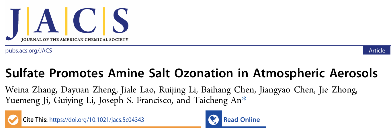 近日,我校环境科学与工程学院安太成教授团队与美国宾夕法尼亚大学Joseph S. Francisco教授团队合作,在大气胺盐颗粒物臭氧化方面取得重要进展。相关成果以“Sulfate Promotes Amine Salt Ozonation in Atmospheric Aerosols”为题,发表于国际化学领域高水平期刊《Journal of the American Chemical Society (JACS), 2025, 147(38), 34327-34338; https://doi.org/10.1021/jacs.5c04343。论文第一作者为我校张维娜副教授,通讯作者为安太成教授。