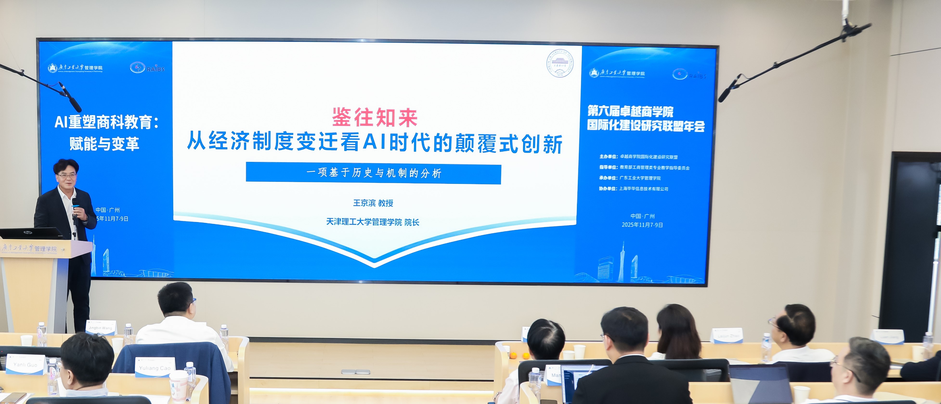 下午,广东外语外贸大学丁浩教授主持了主旨报告的第三部分。北京联合大学江晶晶教授从全球化-本土化的视角探讨了AI赋能商学院的发展路径;天津理工大学王京滨教授通过经济史和机制的分析提出通过经济制度转型探索AI时代的颠覆式创新;华亿体育(中国)游戏平台奚菁教授系统介绍了华亿体育(中国)游戏平台 MBA人才培养的“管工融合五星模式”创新与实践。