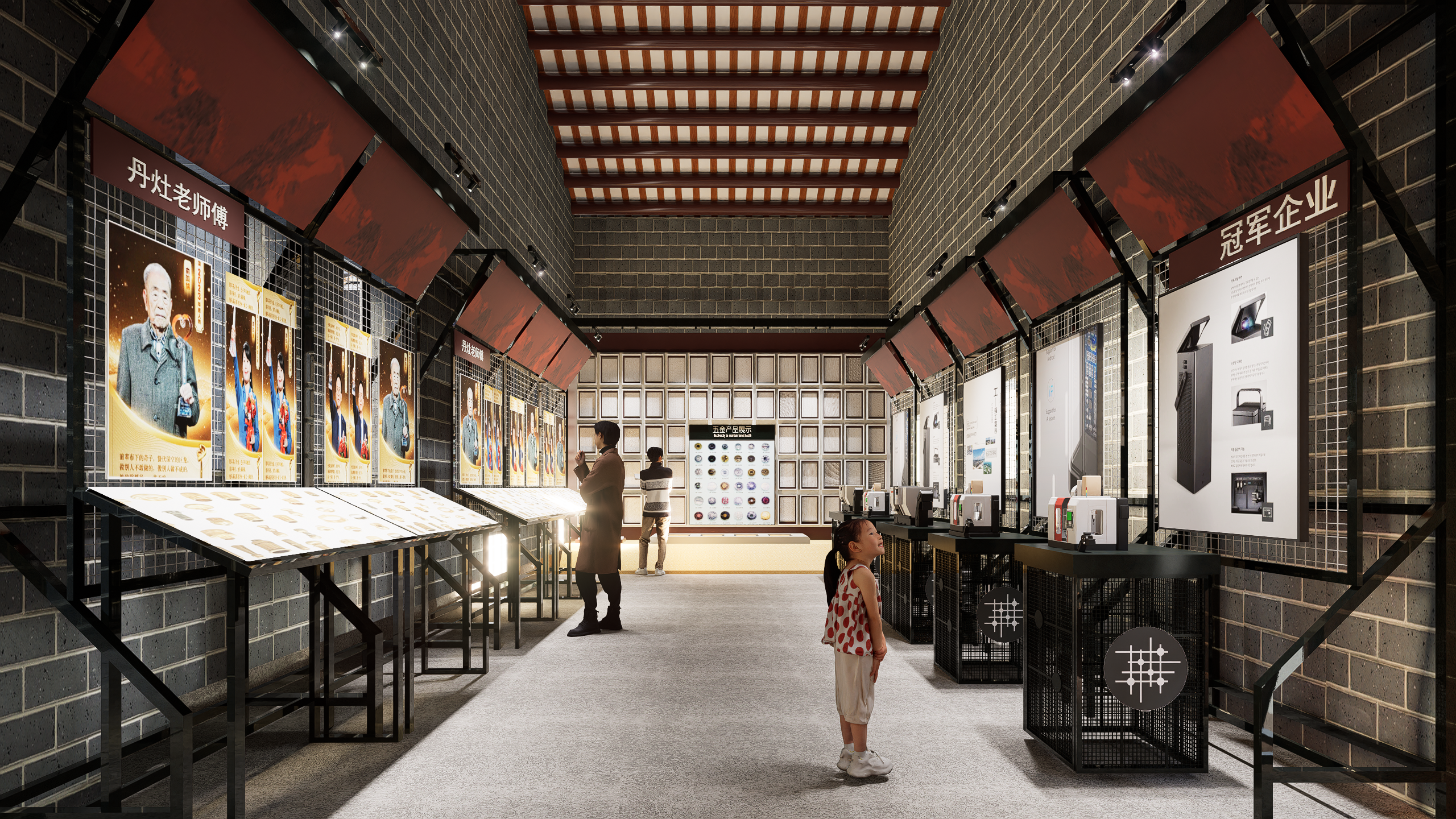 在当地政府和社区的支持下,师生团队深入梳理南沙社区发展脉络,以空间叙事的思路将展区分为“建村谋局-贺富佳话-万元群像-薪火相传-领航新篇”五大篇章,空间设计充分尊重祠堂原有格局,保留青砖墙面、木梁结构等传统元素;展陈设计则采用可活动落地展架,将照明系统集成于展架之上,避免对古建梁柱造成破坏。纪念馆中还设计了互动体验区,让参观者体验老式手啤机操作,亲身感受改革开放初期的劳动氛围。