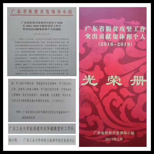 本网讯 近日,广东省扶贫开发领导小组对在2016~2018年脱贫攻坚工作中作出突出贡献的集体和个人进行全省通报表扬。其中,我校驻英德市东华镇雅堂村工作队获得了“广东省2016~2018年脱贫攻坚突出贡献集体”奖,驻村工作队队长、第一书记杨小帆同志获得了“广东省2016~2018年脱贫攻坚突出贡献个人”奖。